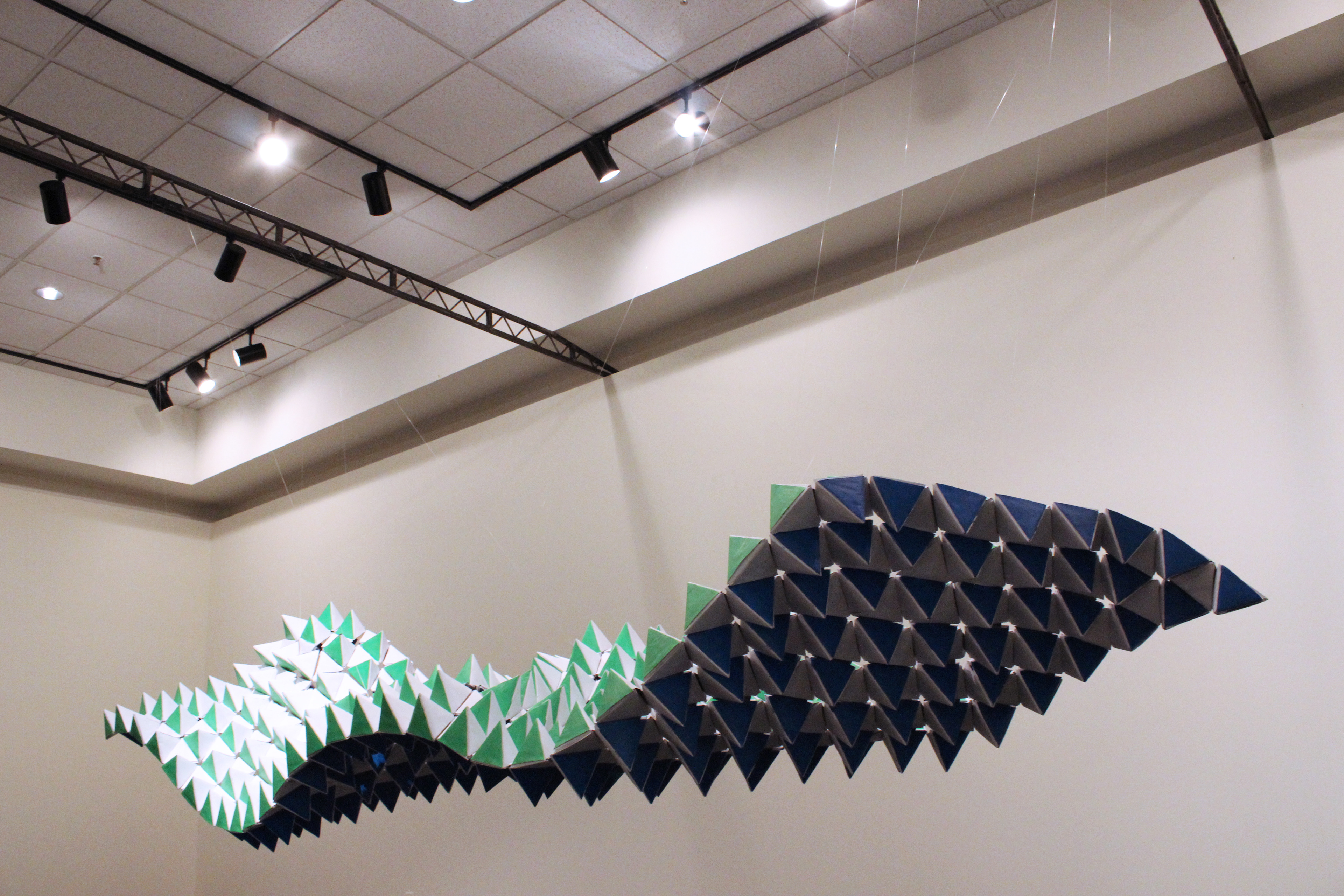 Thirty students from the University of Nebraska - Lincoln cut and folded 2000 sheets of recycled copy paper into 500 tetrahedrons. The installation was photographed at both the University of Nebraska - Lincoln and at the Big Omaha 2013 conference.